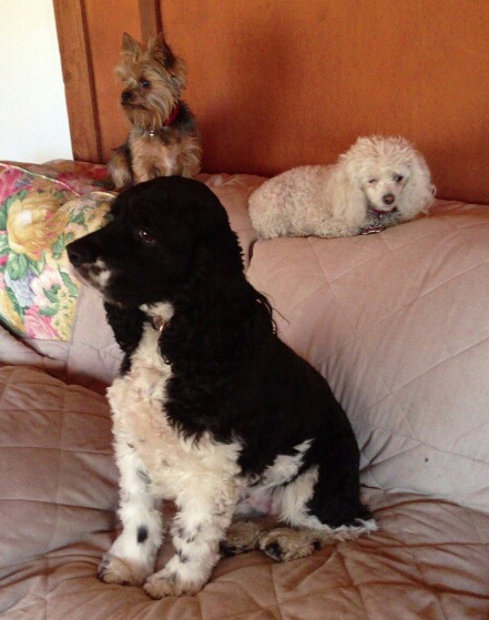 – Andy is my Springer Spaniel and he is the boss. Angel my teacup poodle thinks she is a princess and Booker, my teacup yorkie, thinks he’s a big dog. He protects everything.